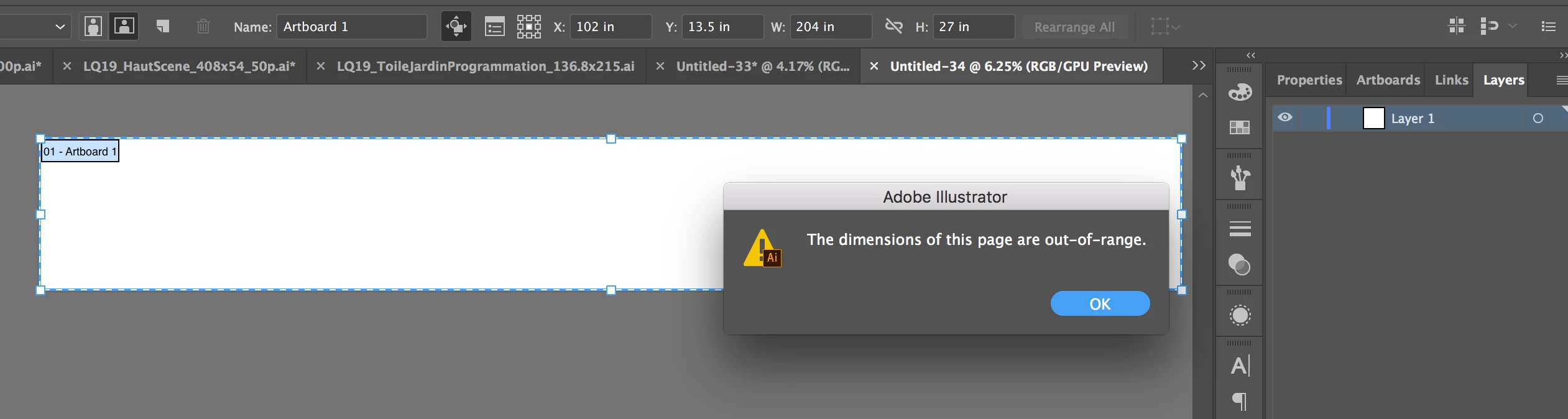 I have the same problem. If I create a new document with the same dimension with no artwork at all, I still have the same problem ... dimensions are out-of-range.