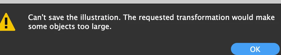"Can't save the illustration. The requested transformation would make some objects too large."