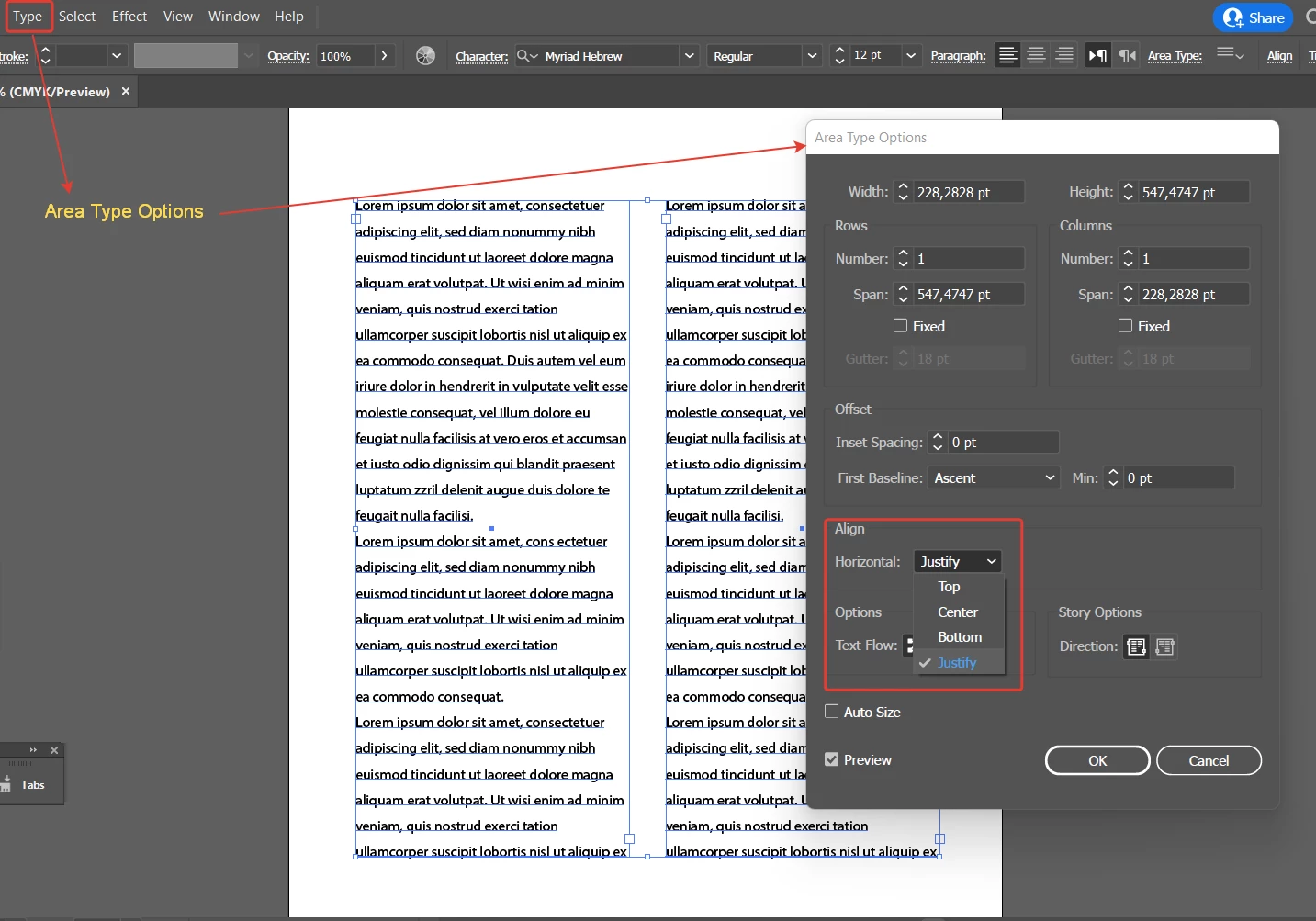 I can't seem to create even depth columns of text. Can this be done in AI at all?