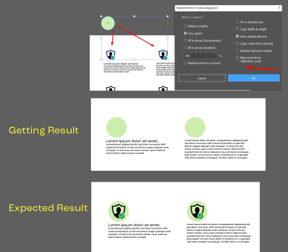 replaceItems is a great script to replace object at targeted place. but while using this script my targeted object replacing at front, but I want to place it at behind it as shown below.