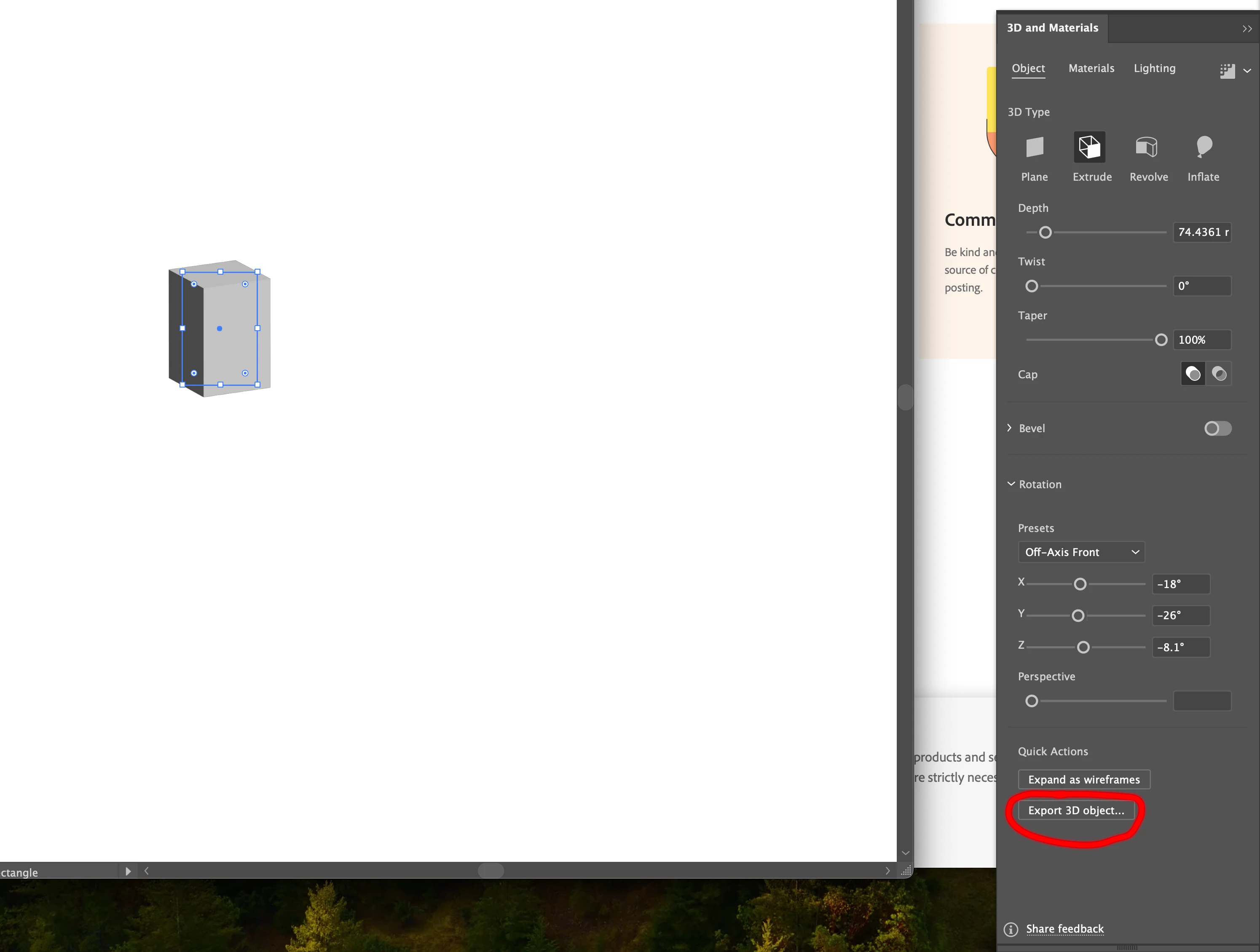 I have been using Illustrator 27.8 for weeks now on a 3D project. Extruding shapes so i can build models in Dimensions. Today though my Export 3D object button (At the bottom of the 3D & materials) has stopped working. The shapes i am creating are simple & have been exporting to .obj for weeks but as of today i can not get anything to work. I have tried previous jobs which have worked & they can no longer be exported to object.