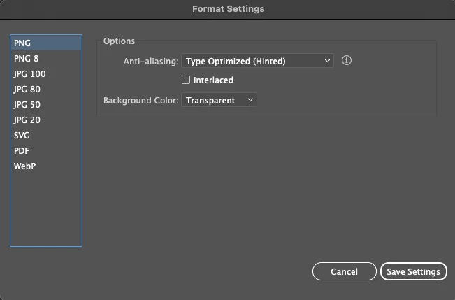 I have been experiencing this bug when accessing the 'format settings' window. When I go to export assets in the Export Selection window and then press the Format Settings options, half of my options are missing, including the PNG 24 option. I've tried reinstalling Illustrator to see if it would fix the issue, and it did for a day, but then it happened again. Im running the latest version and on MacOS Tahoe. Please note that this issue was also occurring on macOS Sanoma. Hope someone can help!