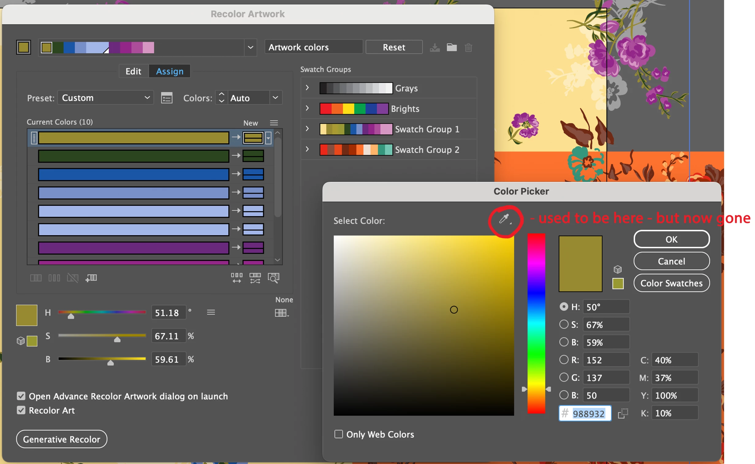 Adobe have since removed it in version 30.0 and its gone from older versions as well (29.8.2). Please adobe can you bring back the eyedropper within recolour artwork, or suggest a fast way around this.