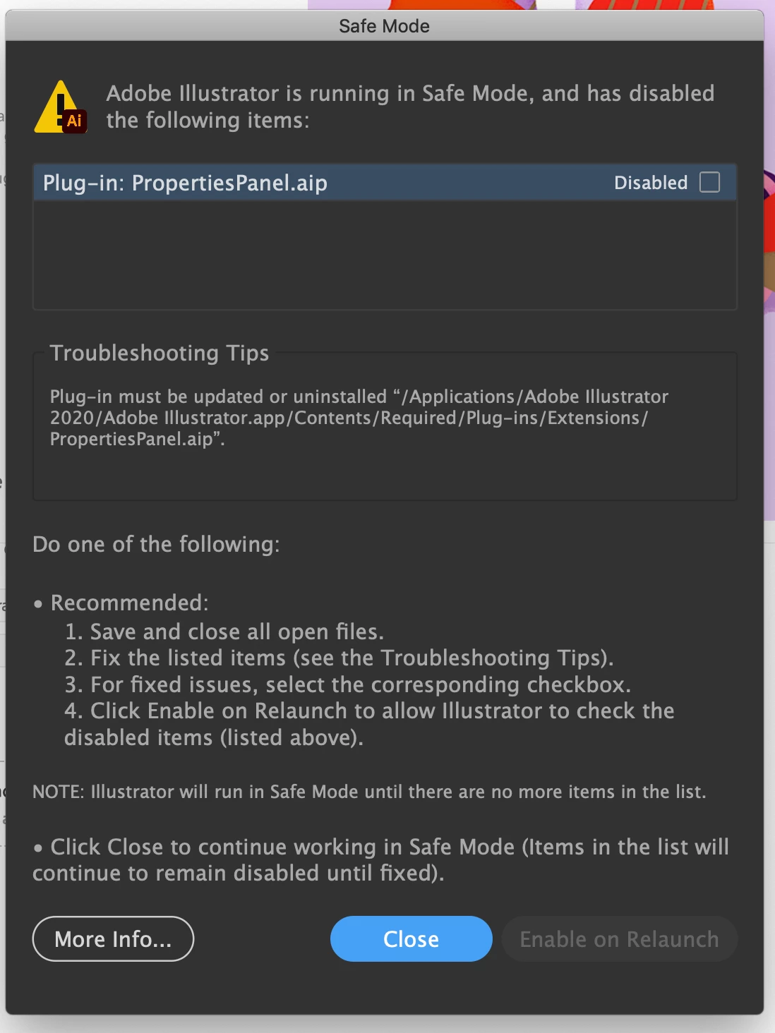 Okay so Adobe illustrator auto-updated itself today and I'm getting the following error message when I open Illustrator. After this plugin error screen, I get the following screen saying that Illustrator has opened in safety mode.