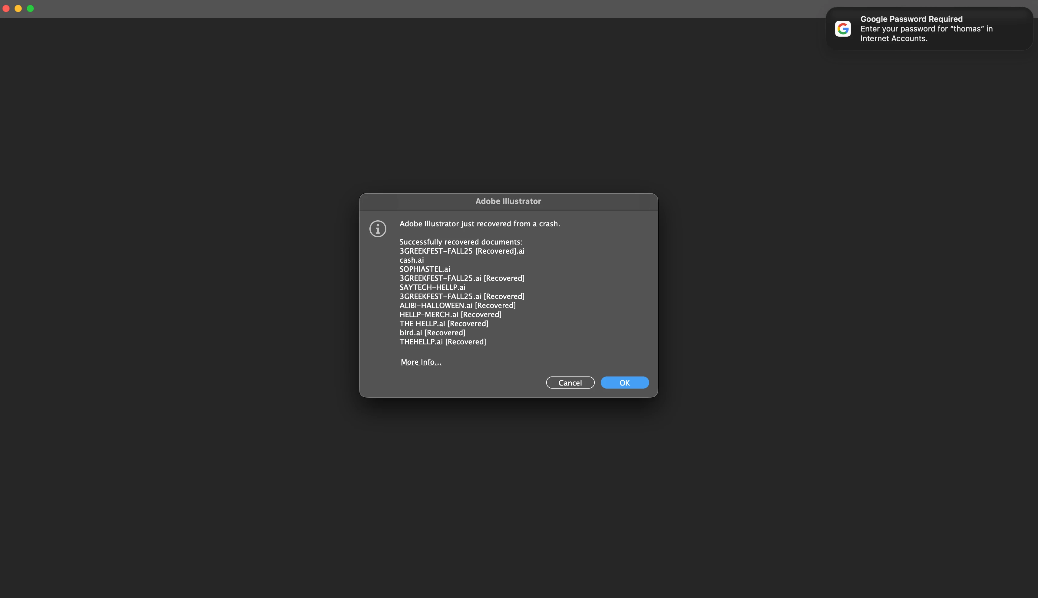 Hi all, i was working last night and illustrator decided to crash, and i had not saved in quite awhile (im on mac tahoe 26.0 and illustrator 29.2.1). when i reopen, i get the recovery pop-up, but i have no idea how to access/find these files. Tutorials online say to find the .aid file in illustrator recover data in finder, and to just open that in illustrator, but that is not physcially possible. I tried copying the recovery file, and giving it an .ai file extension instead, but that wont open in illustrator either. any tips please? when i reopen the normal file (not recovered file) it just loads to my last save. I have not saved the file since adobe crashed and i lost my progress.