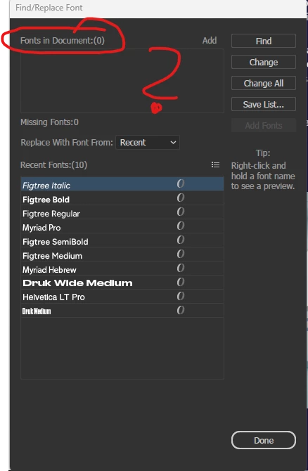 Fonts not showing in Character panel, nor in Character or in Find/Replace Fonts