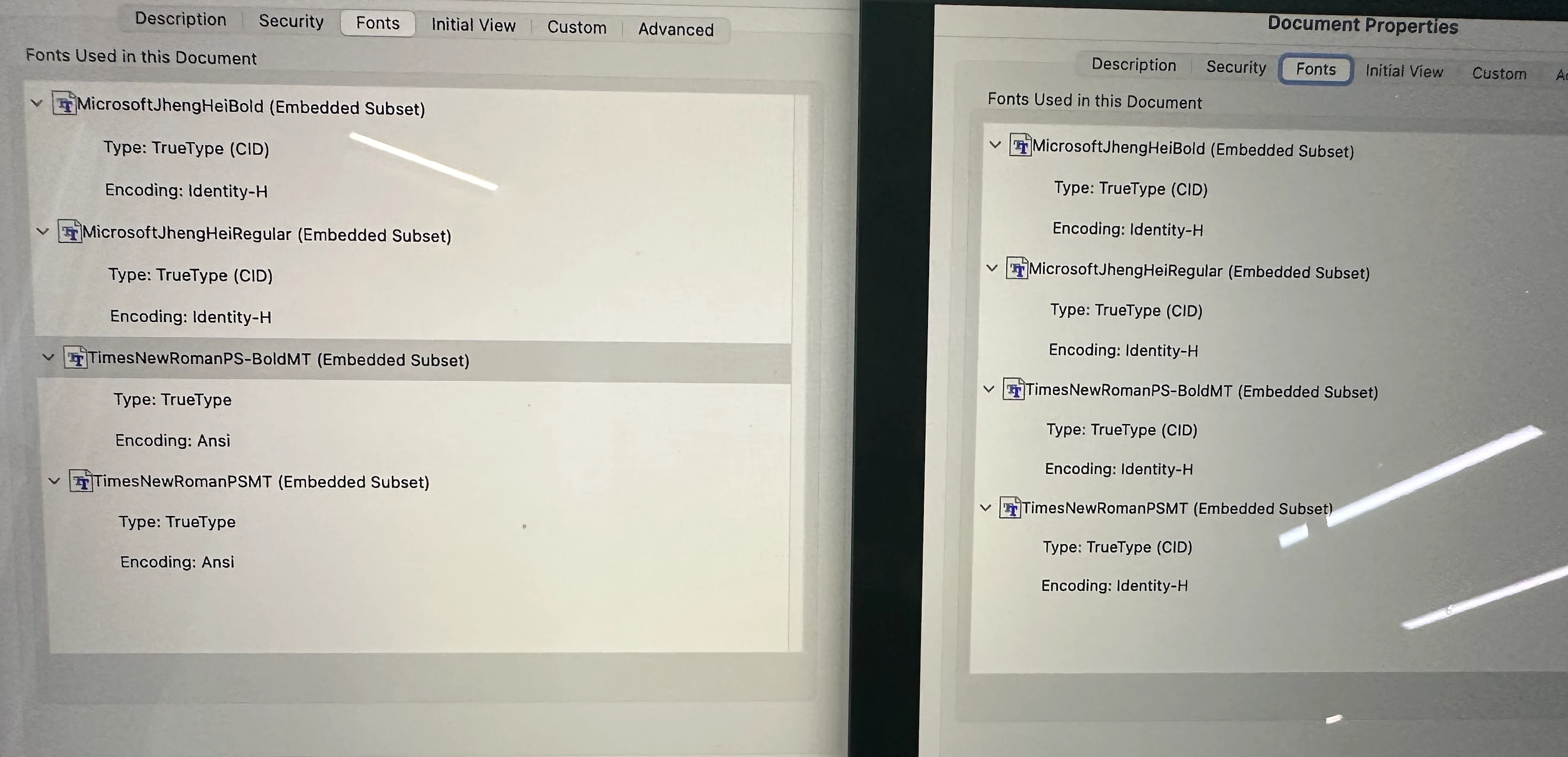 Basically, I have a pdf file that has four fonts which is all in (Embedded Subset) Truetype (CID); encoded in Identity-H.