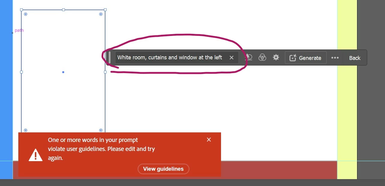 I've asked to generate background in rectangle for description "White room, curtains and window at the left" and got "One or more words in your prompt violate user guidelines". Screenshot is attached.