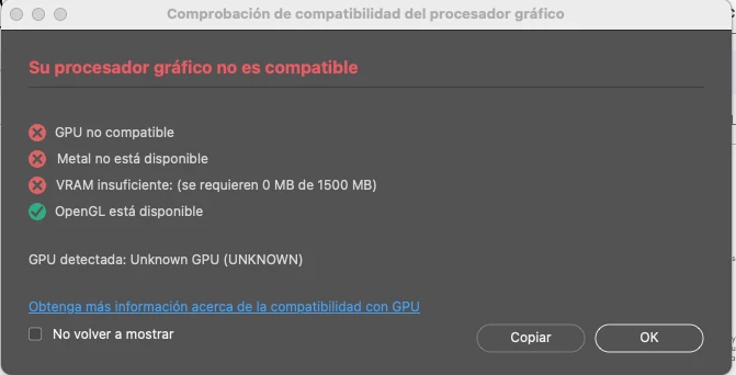 Creo que es un problema de GPU, ya que antes podia alternar entre CPU - GPU y ahora me figura como "No hay ninguna GPU compatible", además al entrar en Photoshop me aparece este cartel (adjunto foto).