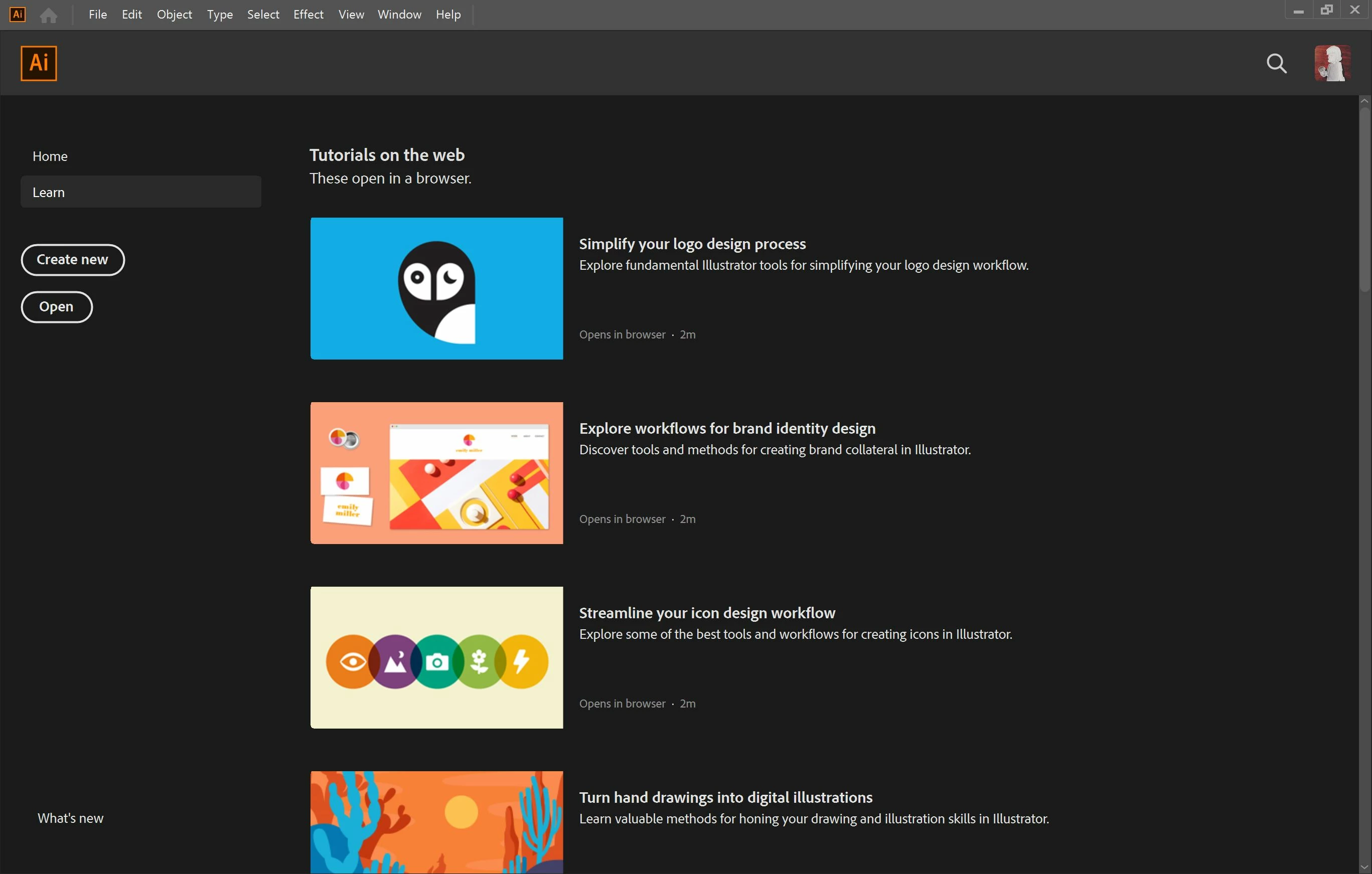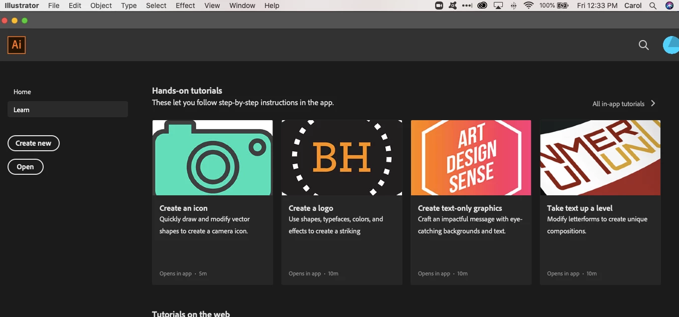 I have 5 hours to do some tutorials offered in the illustrator app that my teacher from school has asssigned to my class. But when I go to the Learn tab, the only tutorials that show up are the online tutorials that you need to download files for, not the in-app ones I need. PLEASE HELP ME FIGURE THIS OUT!!! I don't know what to do. I tried downloading older versions of Illustrator but that didn't work either.