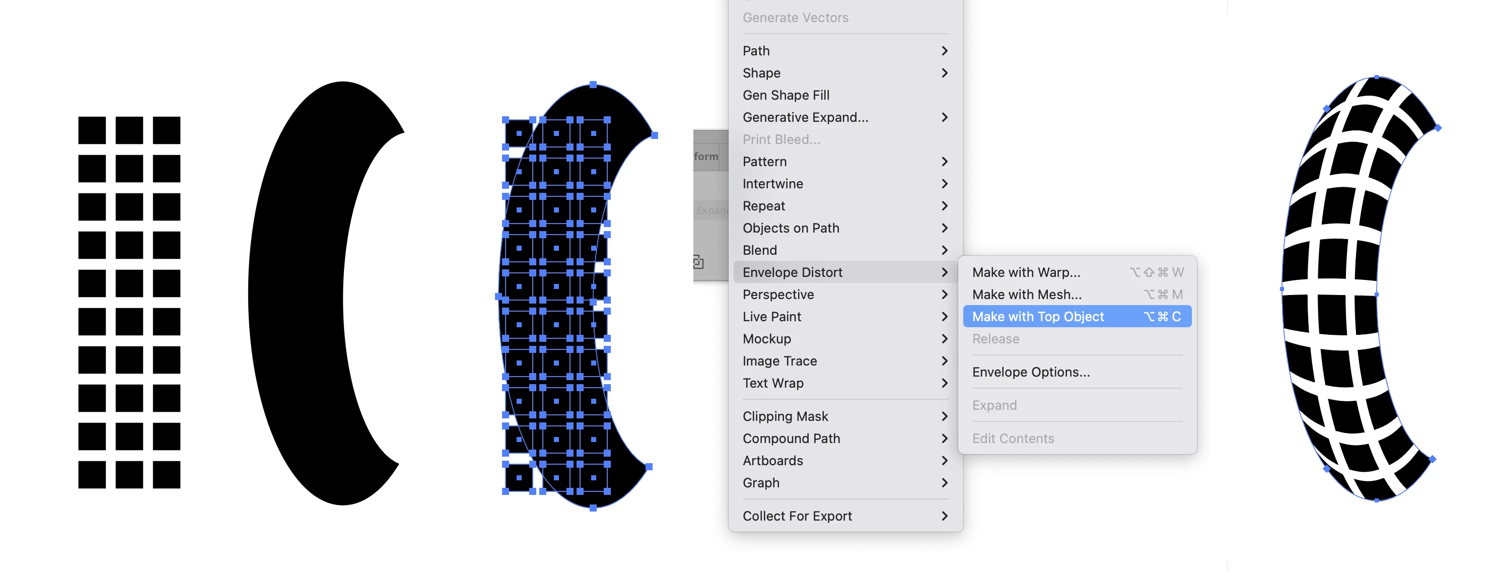 You can do it using the Envelope Distort feature found under the Object Menu. As shown below the crescent shape is placed on top of the tread pattern and then both are selected (make sure that the crescent is either above the pattern in object order or on a higher separate layer). Then "Make with Top Object" is chosen from the Envelope Distort option and the result is seen in the final picture.