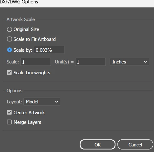 I can't figure out how to configure the DWG import so that I get the same size on the default AI artboard.