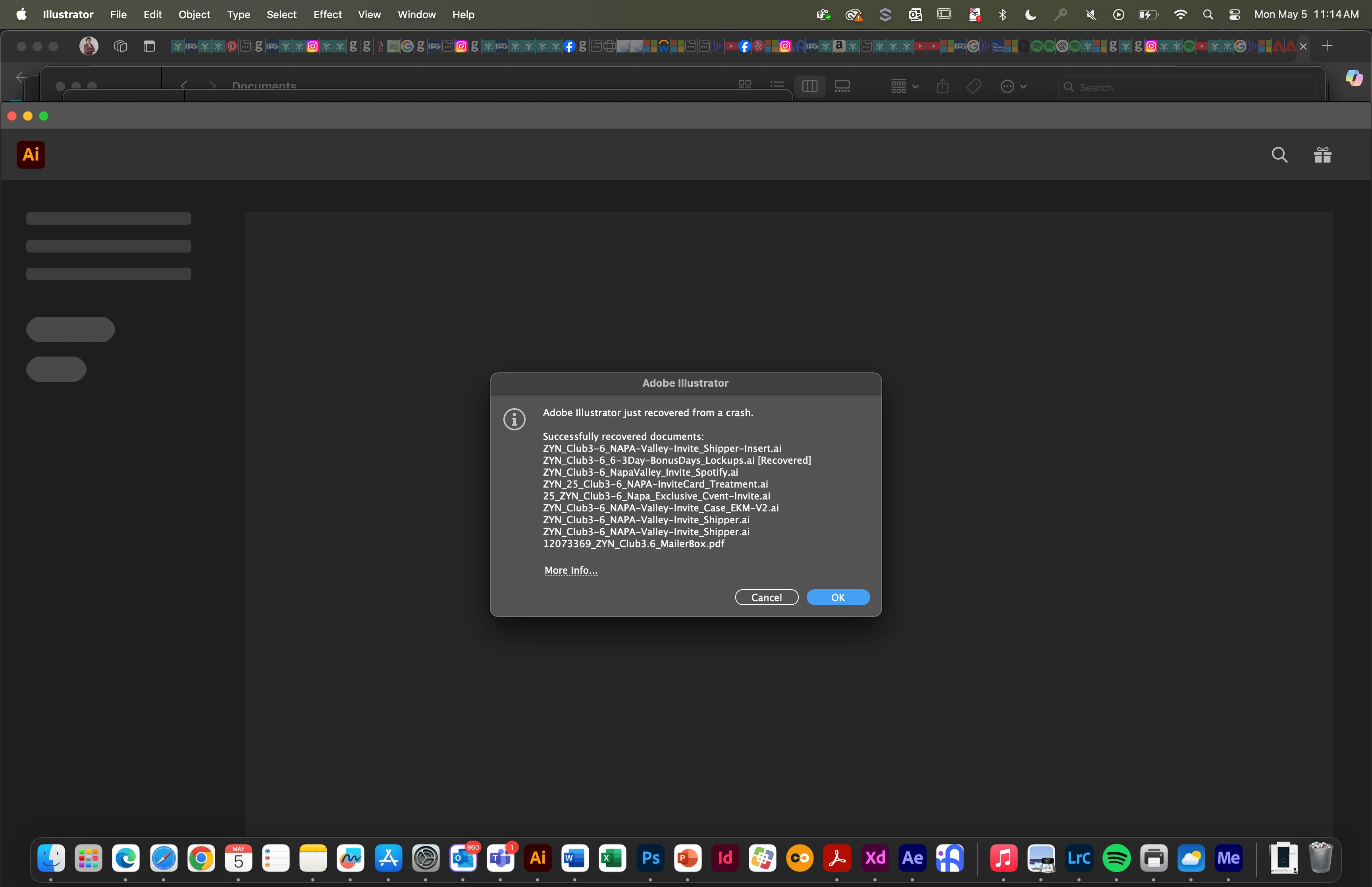My computer shut down and I lost several documents. I open adobe illustrator repeatedly and it will say "The following documents were recovered:...." and I click ok and nothing happens, it stays on the homescreen. I try to go to the recovered docs folder and there are just a bunch of Images folders with .aishm files (e.g.
