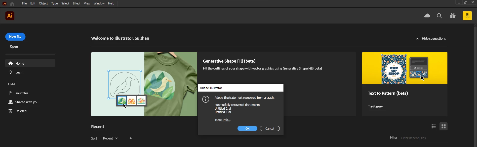 i was working in illustrator (beta) 29.3.0 when it crashed. upon reopening it, i got a popup that it recovered the two opened files. i hit 'confirm' to open the recovered files, then nothing happened. can i recover them manually somehome?