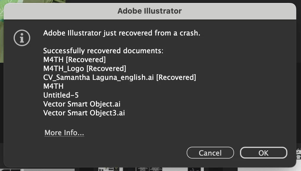Realmente muy cansada y estresada de tener que rehacer mis trabajos hasta 3 veces porque Illustrator se cuelga al querer guardar, al reiniciar la app no muestra el popup para reportar errores y además tampoco recupera los archivos que estaba trabajando antes que se colgara.