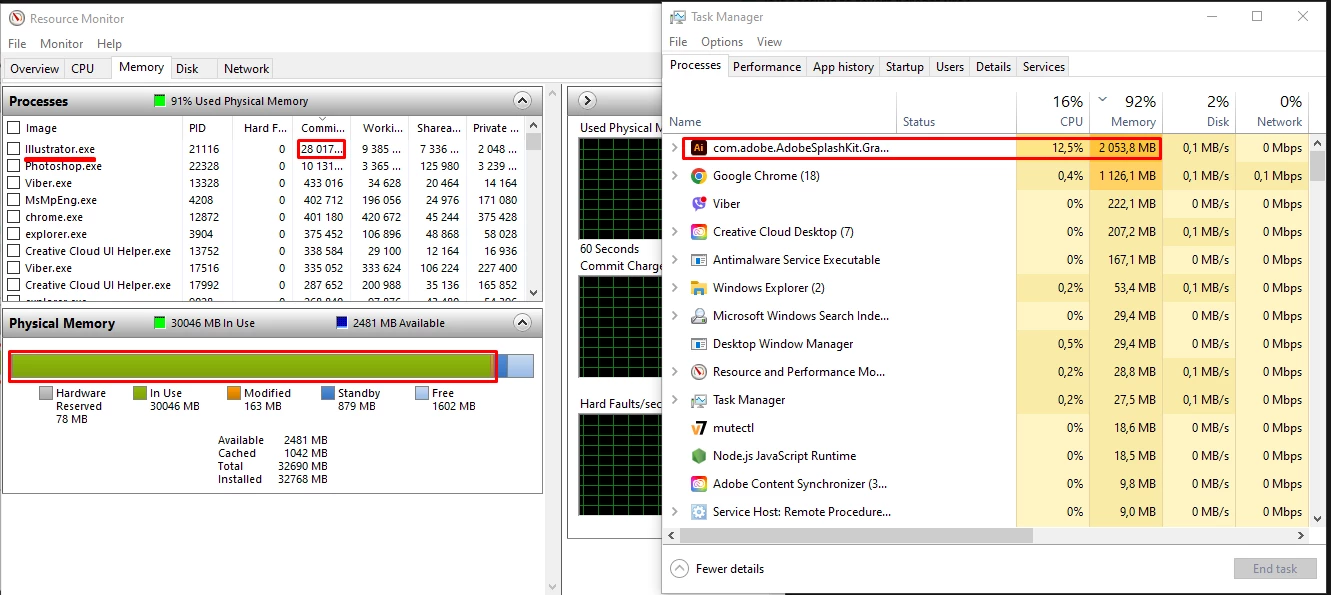 Can anyone help me how is it possible on the task manager illustrator to use 3 Gb but in the resource monitor its showing that its really using 28GB and its taking almost all my RAM