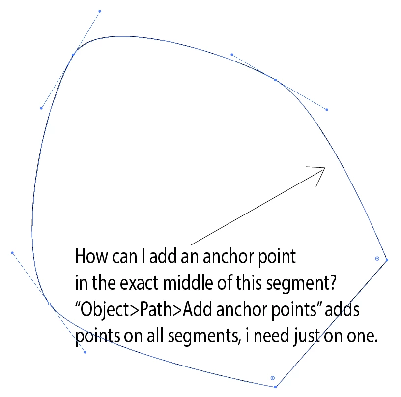 If I use "Object>Path>Add anchor points" it will add anchors in every segment of the path I just need one anchor on one segment. I cannot add multiple points and delete the unwanted ones because it will deform the path in other areas.