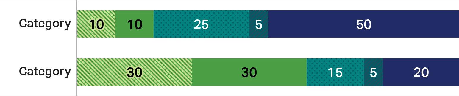 How do I add data labels on a stacked bar chart on Illustrator? I have a chart of 7 bars, each has 3 - 5 values inside the bar (makes a total of 100%). I've googled the s**t out of google and can't seem to find an answer. Manual work is not an option.