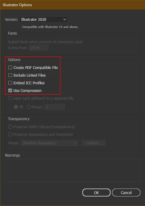 I was wondering if it's possible to change the default check boxes in the "Save As" dialog box in Illustrator after creating a new file?