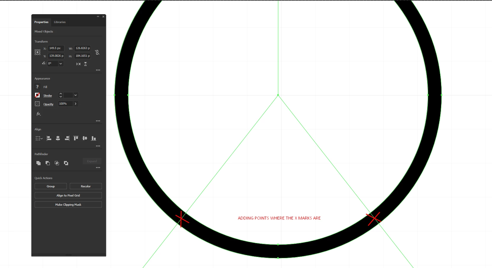I'm trying to make a circle which has some of its properties cut off. I'm using the pathfinder tool, adding lines to cut off where I don't need the rest of the shape. One problem I'm facing is: