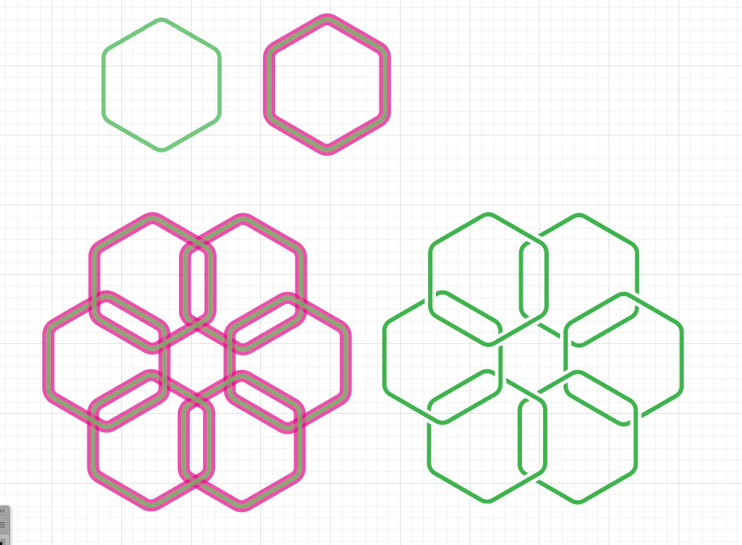 1) Create a black fill/nostroke rectangle with a width equalling the desired cutout of the lower hexagon at the upper left (or lower right intersection) and centred on the left vertical part of the other/upper hexagon;
