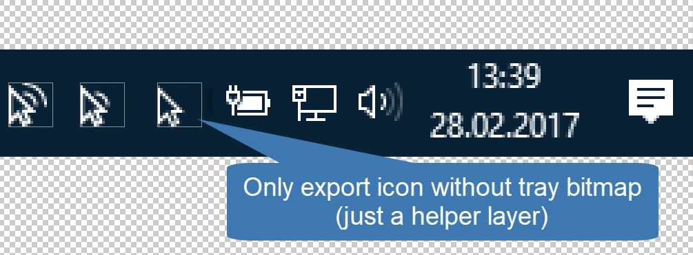 Application: We create tray bar icons and use a bitmap image of the Windows tray as a visual guidance:
