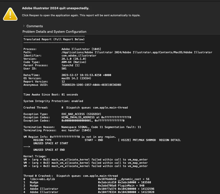 {"app_name":"Adobe Illustrator","timestamp":"2024-02-10 16:44:51.00 +0100","app_version":"28.2.0","slice_uuid":"d65987c1-00fd-3117-bf3c-4564e9869210","build_version":"28.2.0","platform":1,"bundleID":"com.adobe.illustrator","share_with_app_devs":0,"is_first_party":0,"bug_type":"309","os_version":"macOS 14.4 (23E5191e)","roots_installed":0,"name":"Adobe Illustrator","incident_id":"2729B49A-96AA-4180-B853-7B77AA482AC8"}