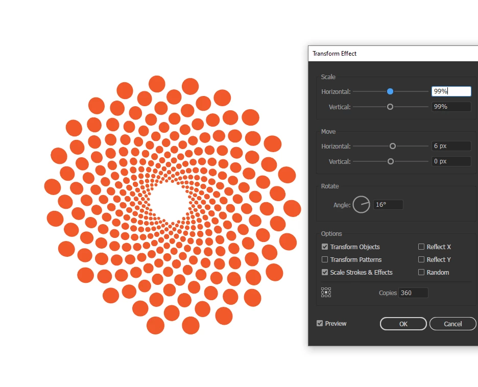 How can I get this pattern with the circles, but the circle in the centre to be the large one, and as the circles are going outwards they become smaller?