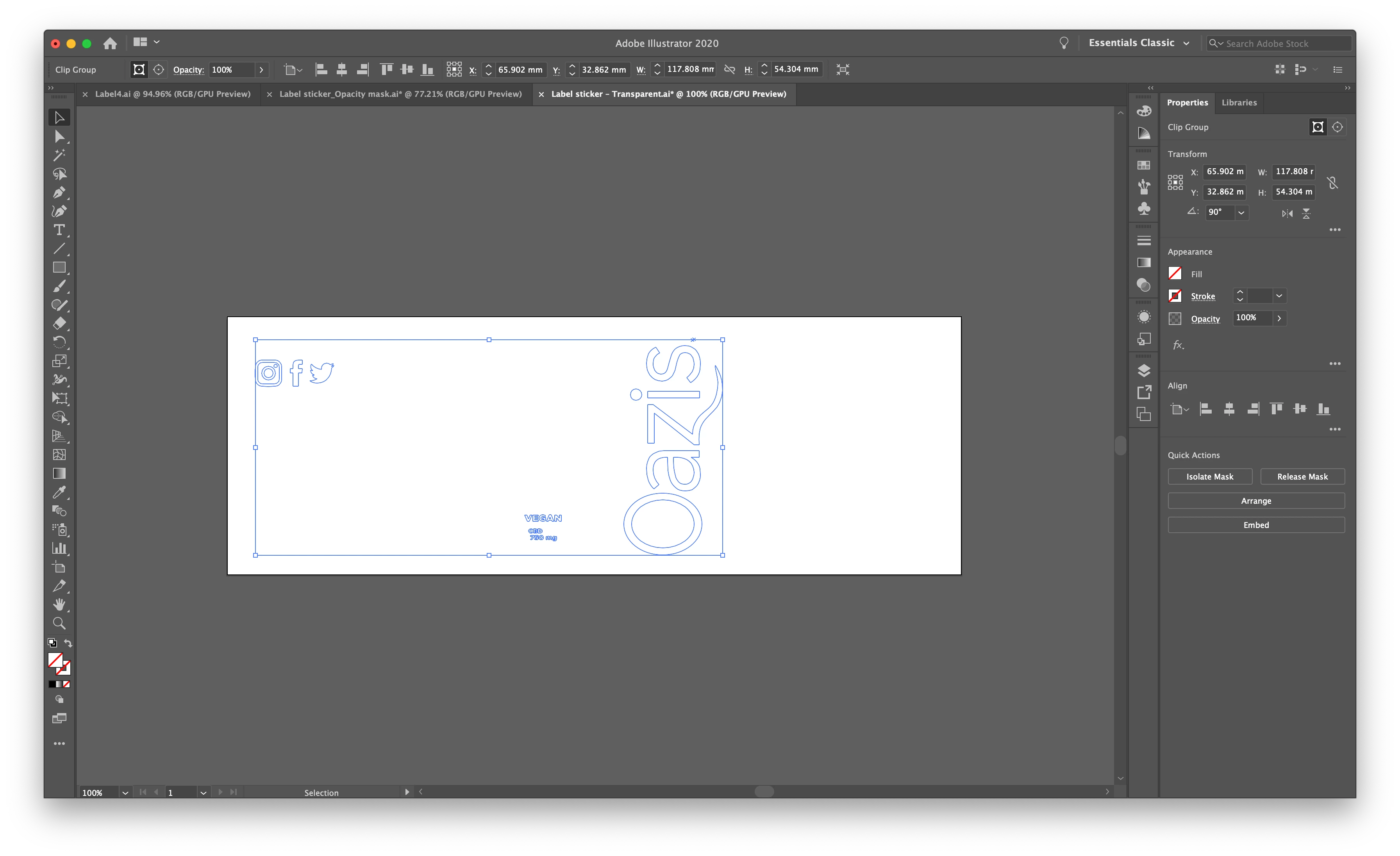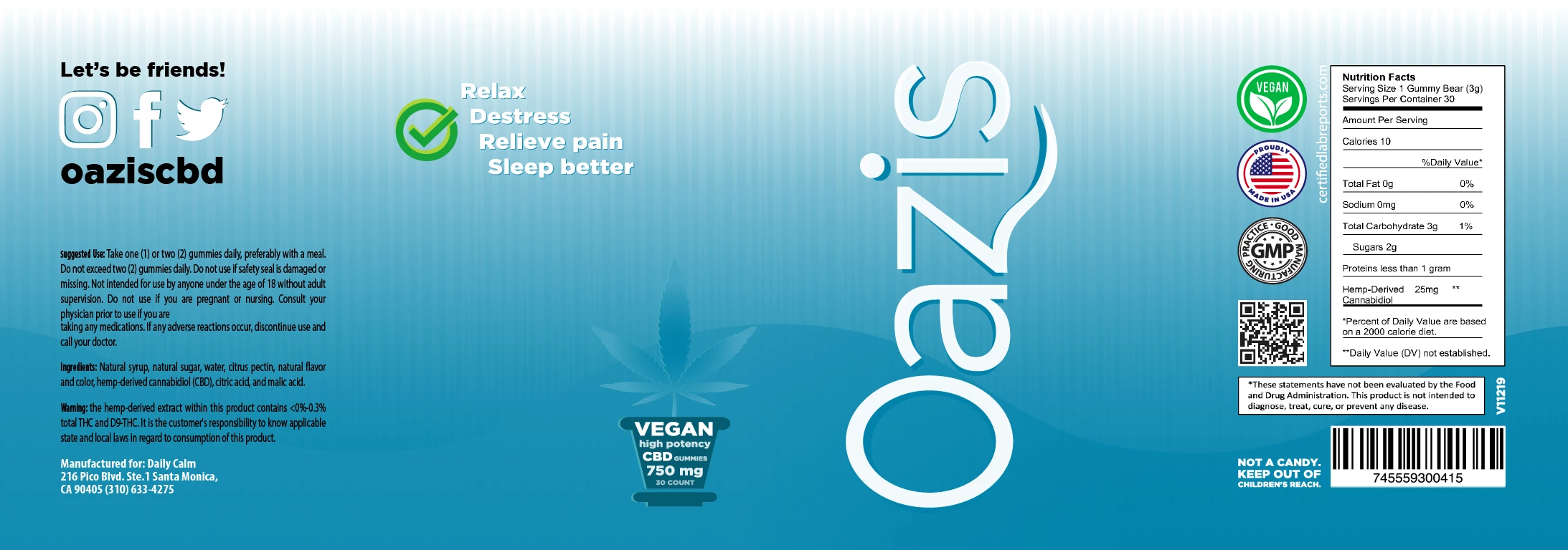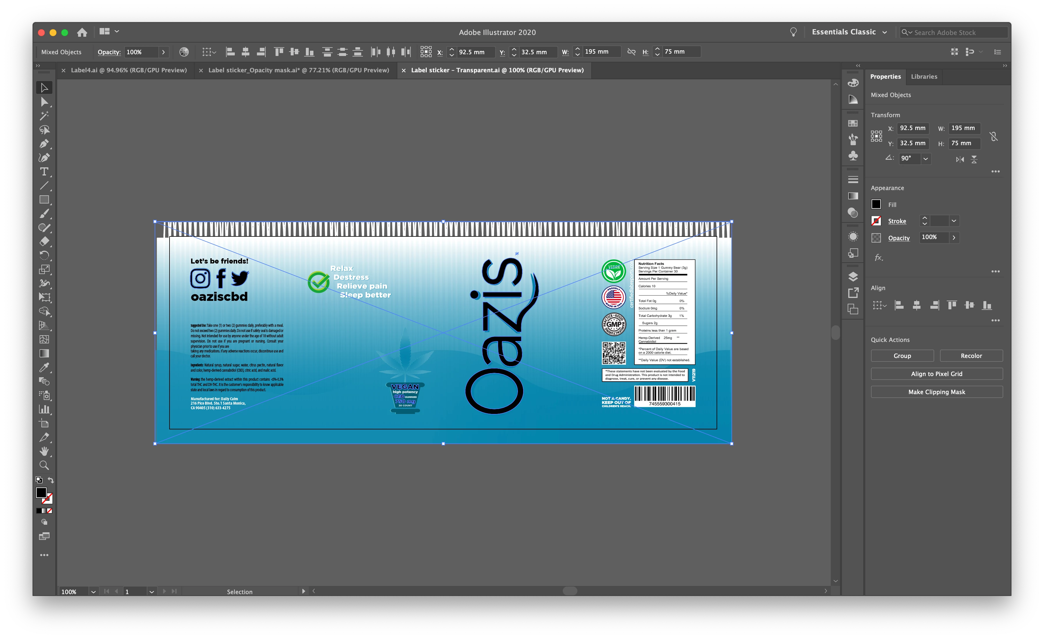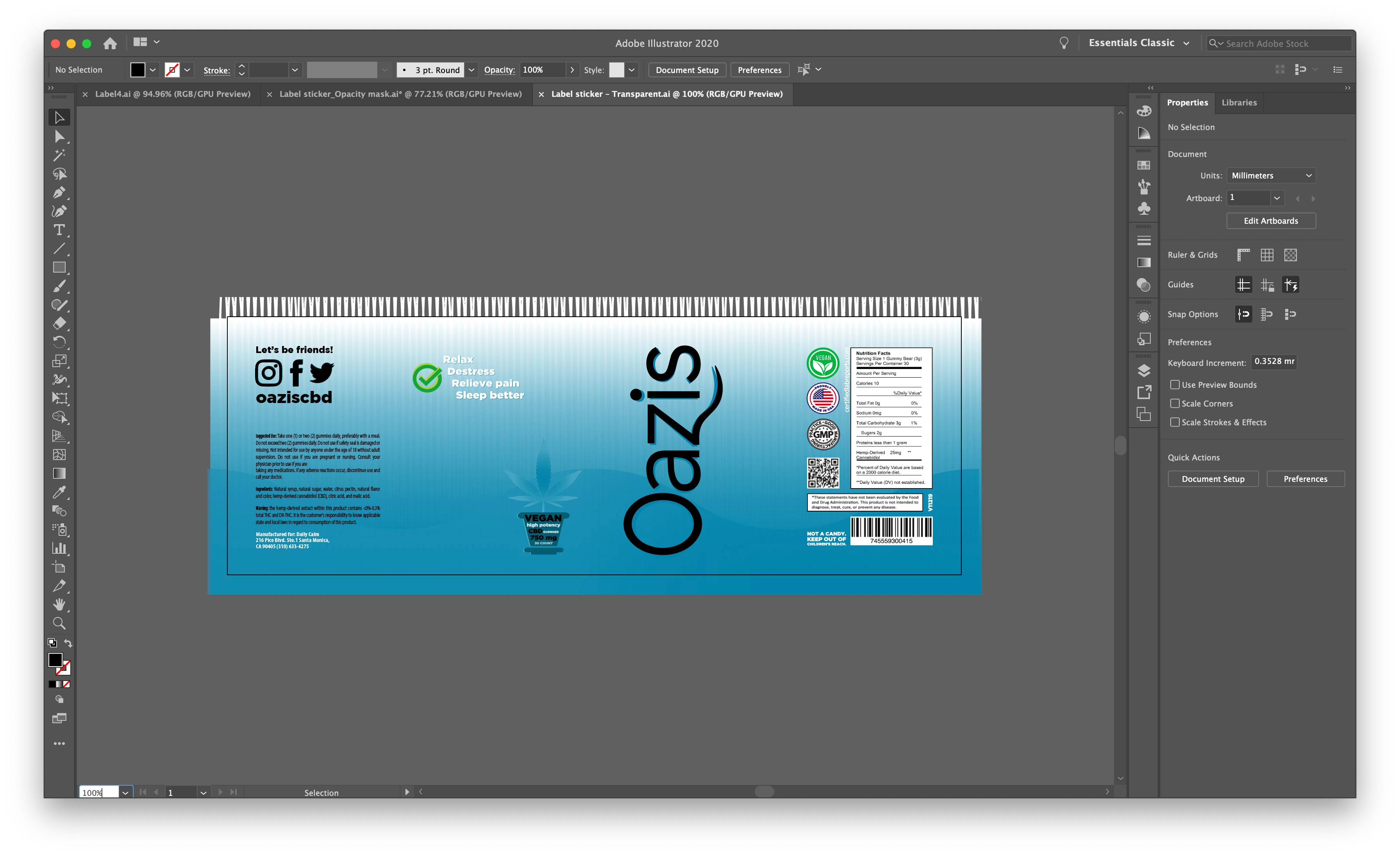 Attached image: The vertical "Oazis" script, "Vegan, high potency, … gummies", as well as the social media icons must cut through the blue and the different layers and be transparent so they don't get printed in white.