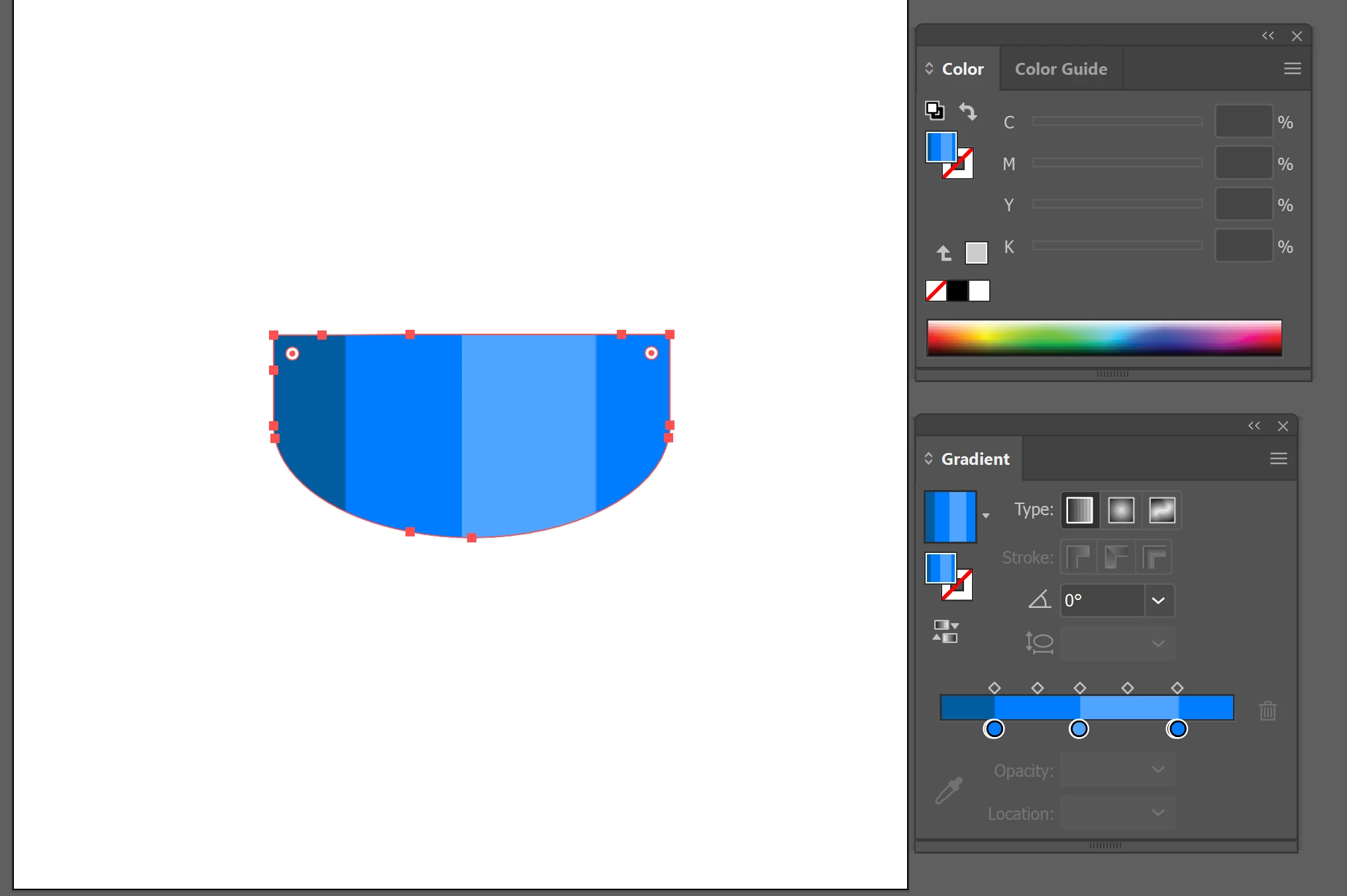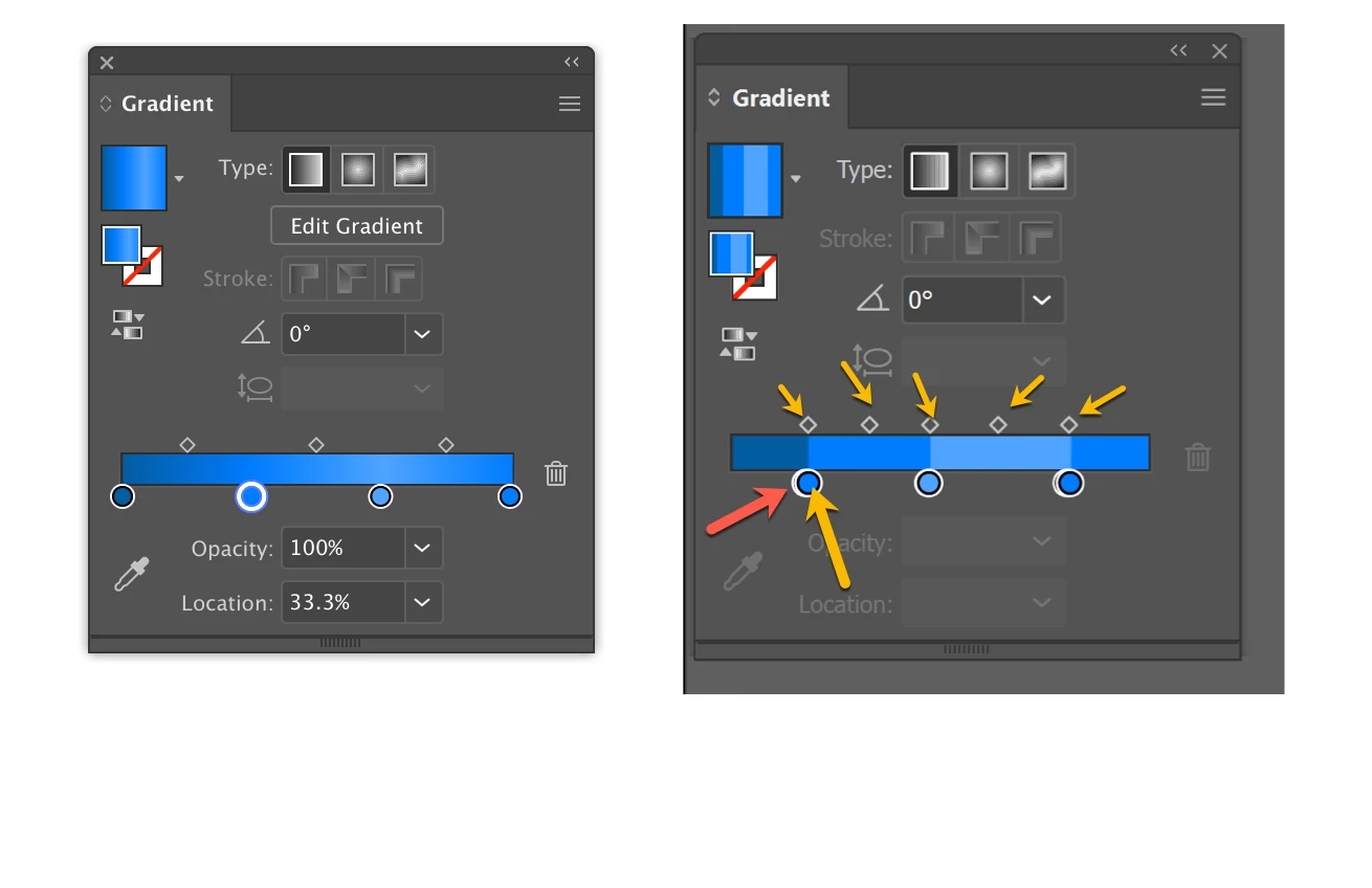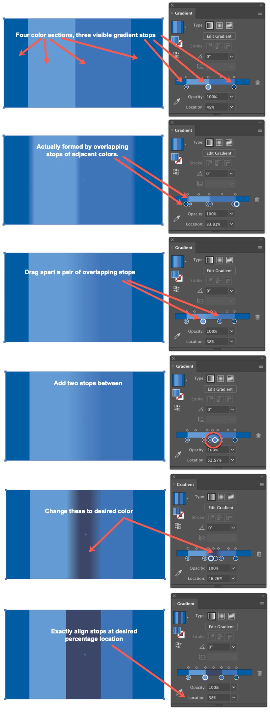 i saw someone can split a shape into 4 portions by using gradient. I want to add 1 more color in middle. But whatever i do, the newly added color will affect neighbour stripe. I google on gradient skill but cannot find tutorial on this skill