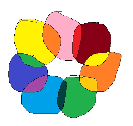 For a print, I need to convert our logo to one color. The current logo is seven shapes that overlap. Each shape is semi-transparent. This means that when you view the logo, it's made up of lots of colors where the shapes are overlapping each other. Attached is an example which looks nothing like the logo. But it shows that there are 7 shapes which intersect each other.