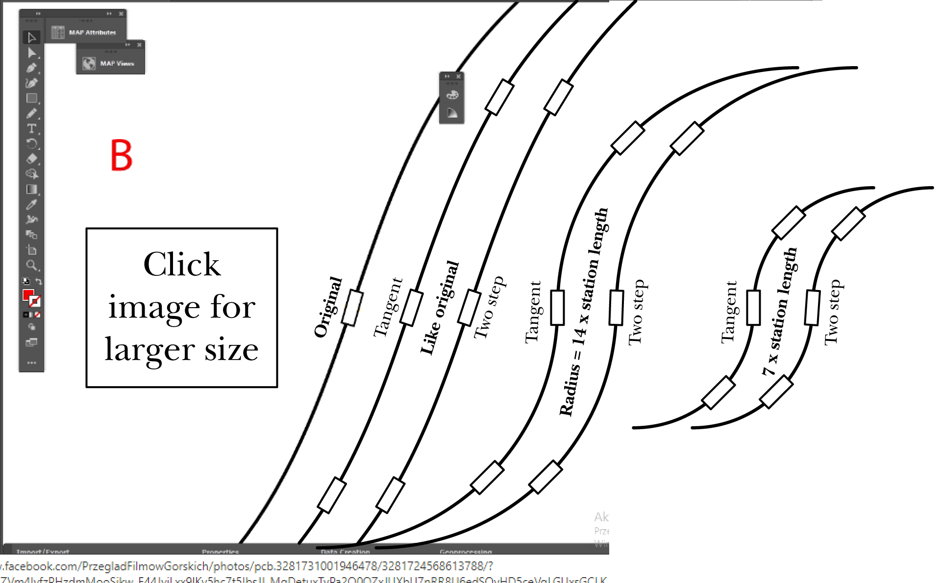 I can see from the map that many of the curves are much sharper than the ones I drew (radius 14 x the station length), about twice as sharp at the very station in Roppen, and I believe that a stretch like the one to the west of Landeck may hit a station somewhere with a much sharper curve.