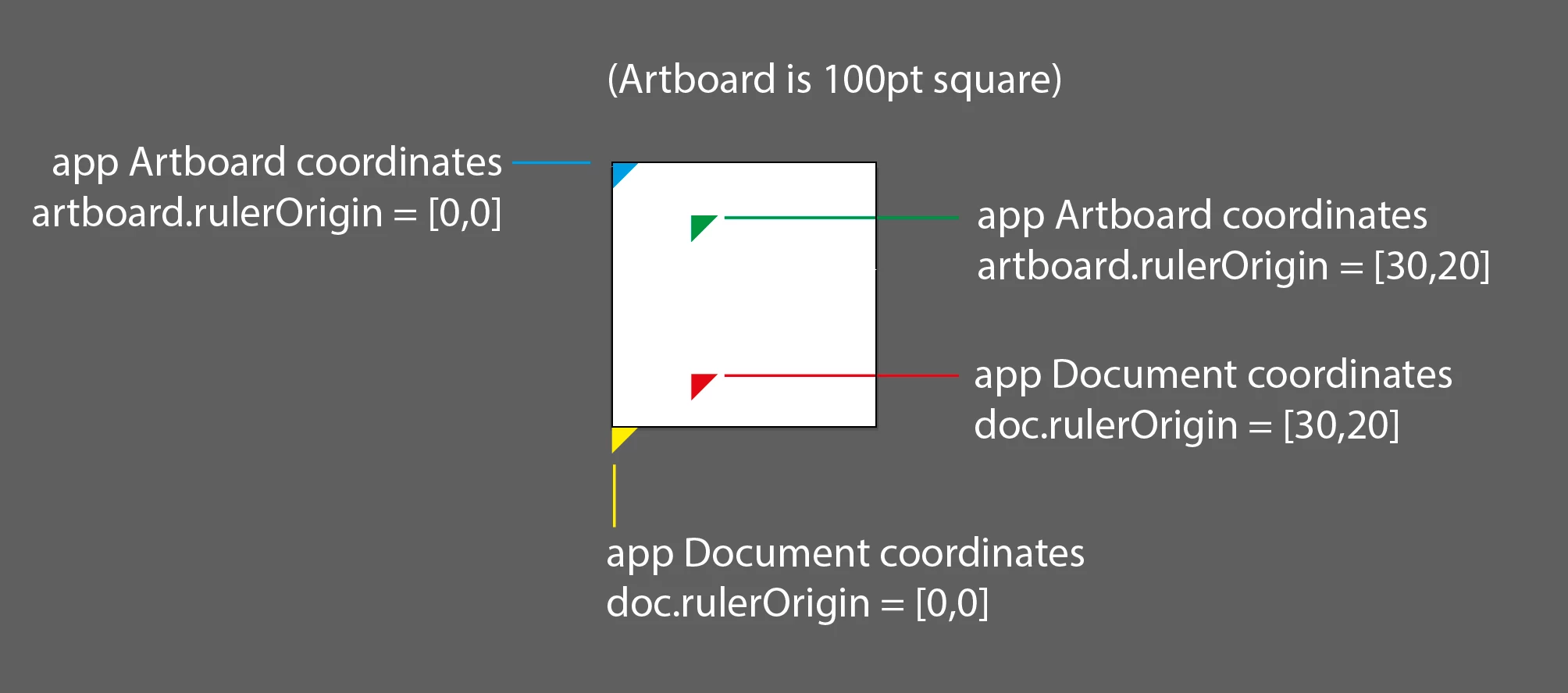 If you have a careful look at that you will see that artboard coordinates go from topleft [0,0] with positive Y down, but document coordinates go from bottom left [0,0] with positive Y up. Note that each time I have set the position of each triangle to [0,0], so the change in positions is solely due to coordinateSystem and rulerOrigin.
