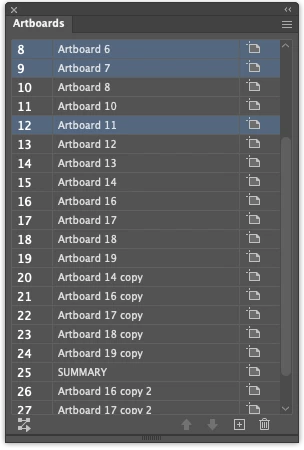 Multi-selection in the Artboards panel (Cmd+click to select rows 7 and 8 simultaneously, as in your screenshot) — this panel UI state has no corresponding DOM property. It is pure interface state, not reflected in the ExtendScript object model. Every expert source, the official JS reference, and the Illustrator Scripting Guide confirm the Artboard object has only: artboardRect, name, showCenter, showCrossHairs, showSafeAreas, rulerOrigin — no isSelected.
