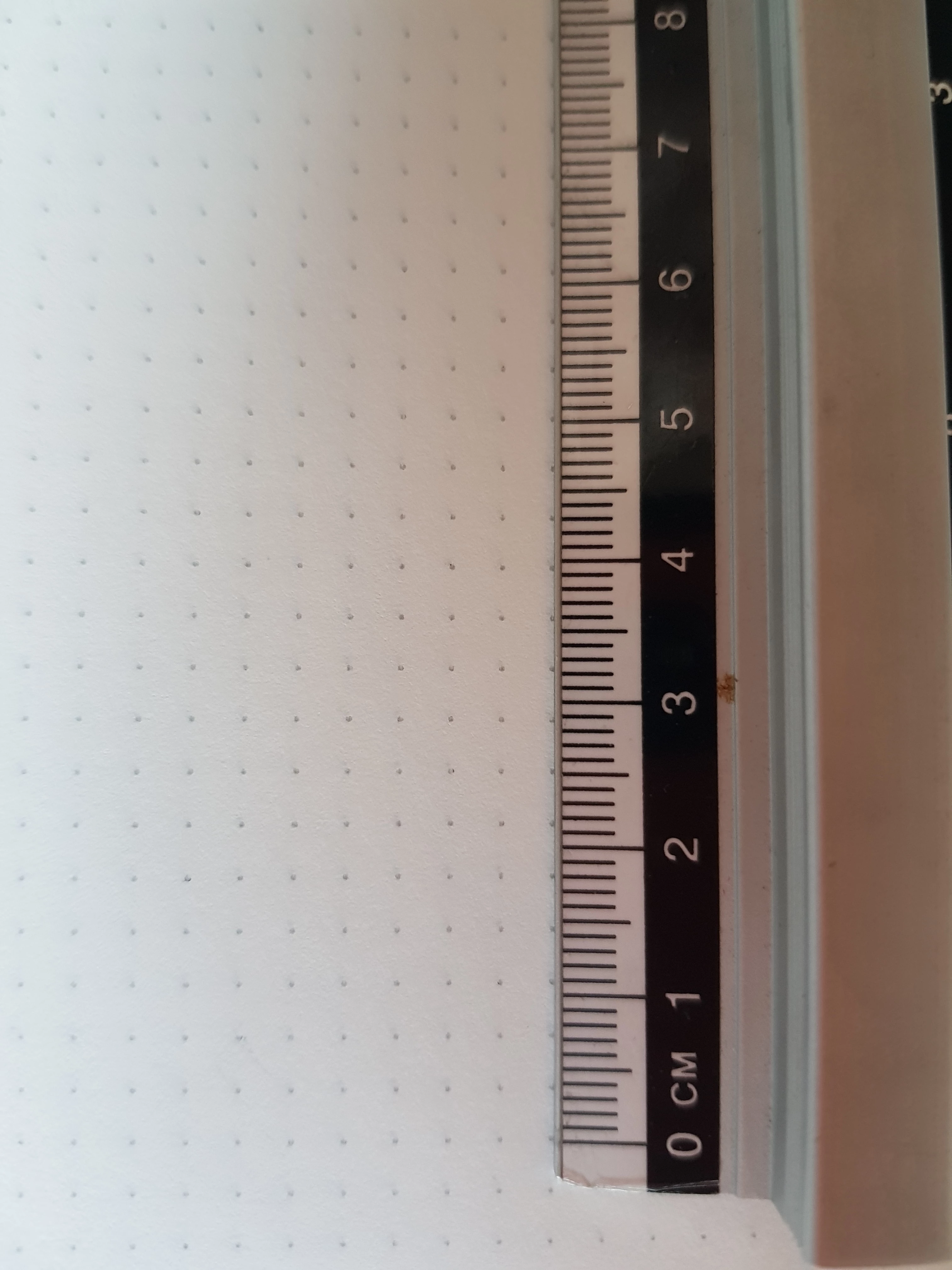 I used a fairly standard dot grid notebook (to be exact - Fabriano Ecoqua [glued version] A4 notebook), I believe it uses the standard square grid size, except it is dots. I do not have a very accurate or micro ruler, but my guess is that it is between 3.5mm and 4.5mm. Talking in centimeters, I noticed that the dots that lined up (from the 0 mark on the ruler) are the one at 2.5 cm, then again at 9 cm, then again at 11.5 cm, then again at 15.5 cm, then again at 18 cm, then again at 22 cm, then again at 24.5 cm, etc.