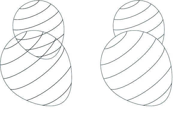 Thanks to the forum I have been able to do the design to the left, where each stripe of the balloon shape is it's own shape. They can be cut on a laser cutter then put together again like a puzzle. Now I am creating a laser cut design with overlapped shapes, and I need to remove the paths in the overlapping parts so that the final cuts would look like the picture on the right, where I simply used fills to hide the overlaps. I have tried all of the path tools, plus shape builders and I can't seem to cut out those stripes from the lower balloon in the overlap. I managed to do it once, but I worked on it for hours and it was a fluke I can't repeat;)