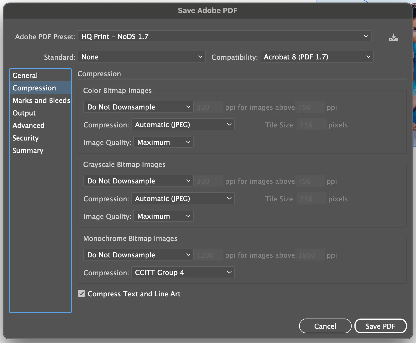 Under "Compression," I Select "Do Not Downsample under: Color Bitmap Images/Grayscale Bitmap Images, and Monochrome Bitmap Images.