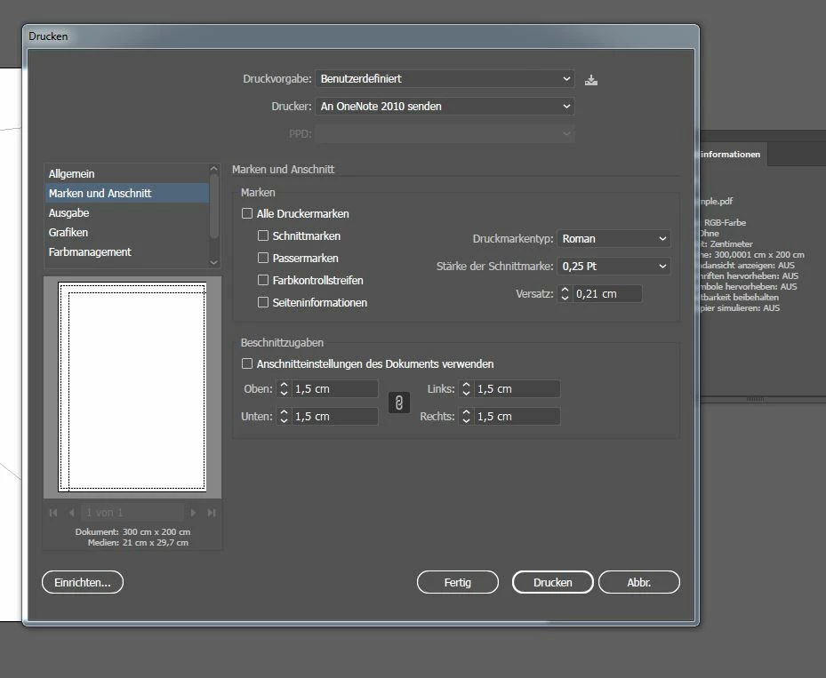 So how can I send it to the virtual printer that at the end there is a margin? Would be great if I can set it manually, so for example 10mm or 20mm, but I would be already ok if I get it with 5mm. So this is crucial since the online print services ask for this. I also thought about selecting a custome size. Then I choose A0 minus 1 cm. Then I output this to pdf. Then I open the pdf in Illustrator, select everything and copy it to a new area of exactly A0. Then I can arrange it that I have 0.5cm margin at each side. However I have to do it manually with every page. And it opens the door for quite a few mistakes if I do it manually.