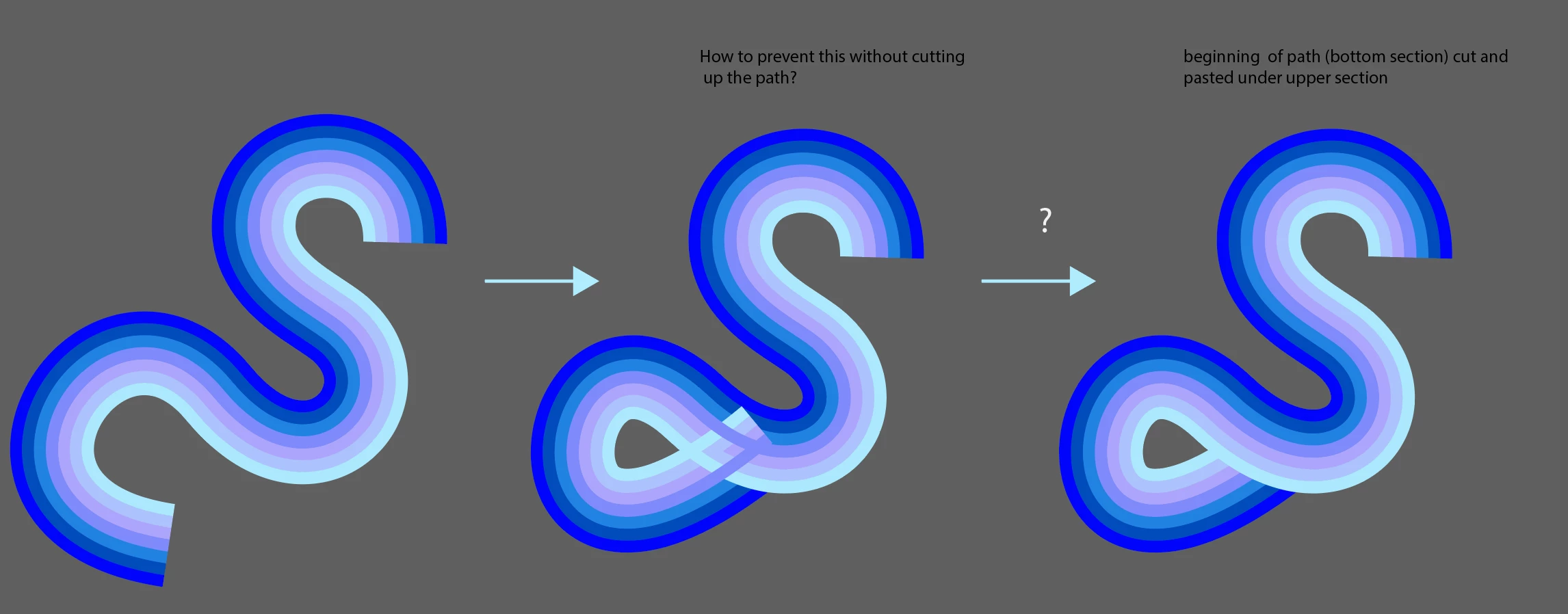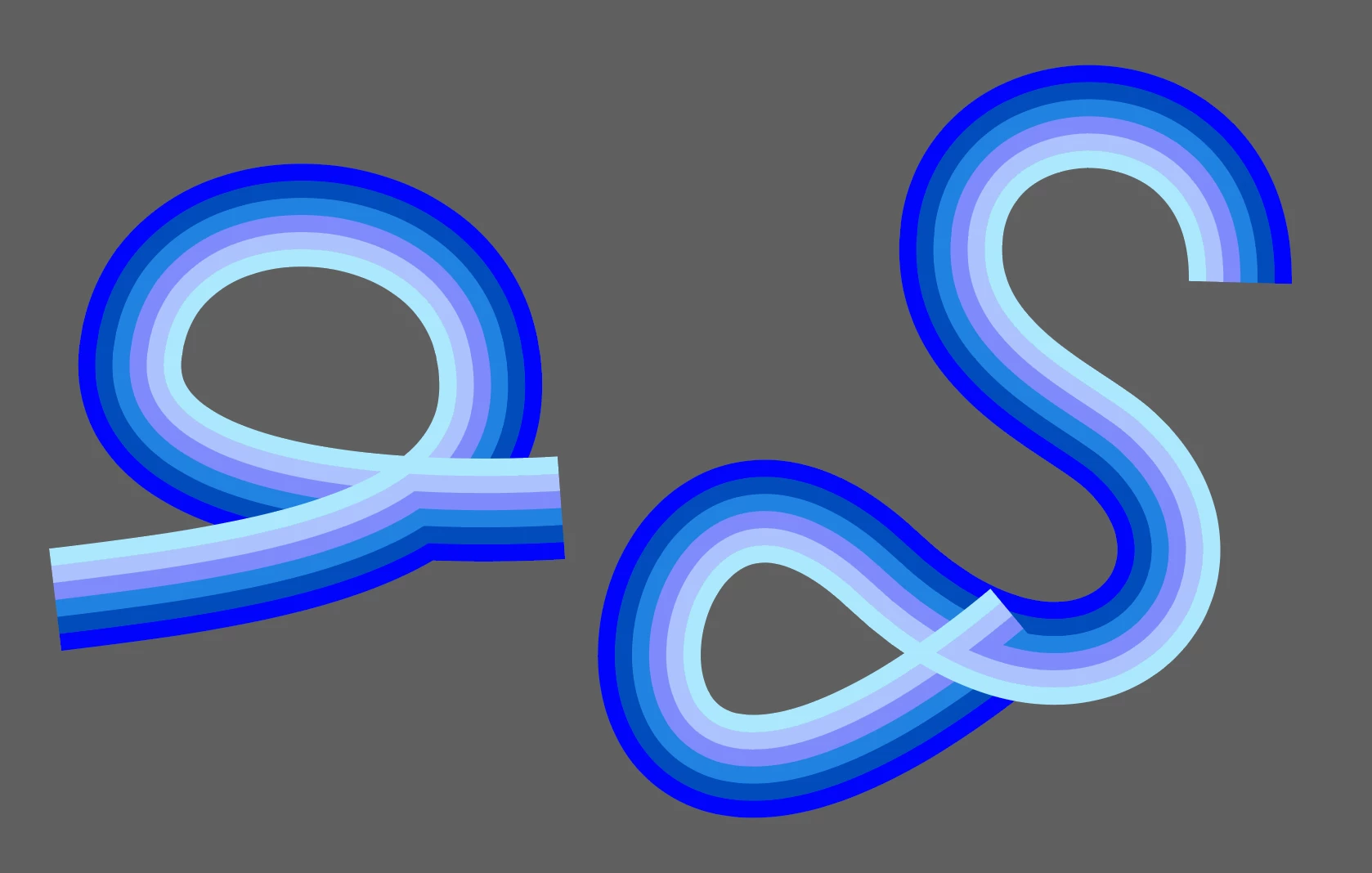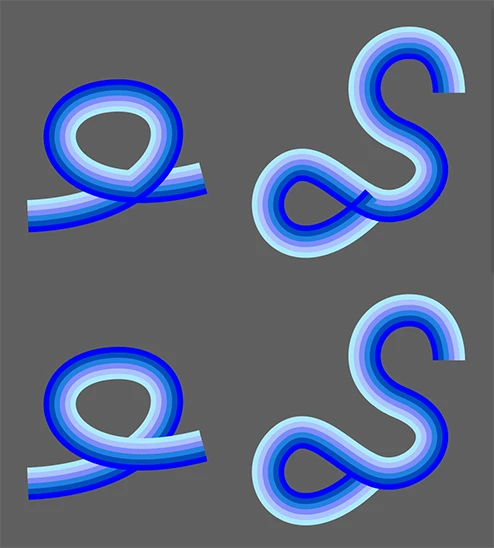 I would like to align multiple colours (in parrallel) to a path to create a rainbow style effect, then have the path/colours overlap itself at various points so that any overlapping portions completely obscure the sections below.