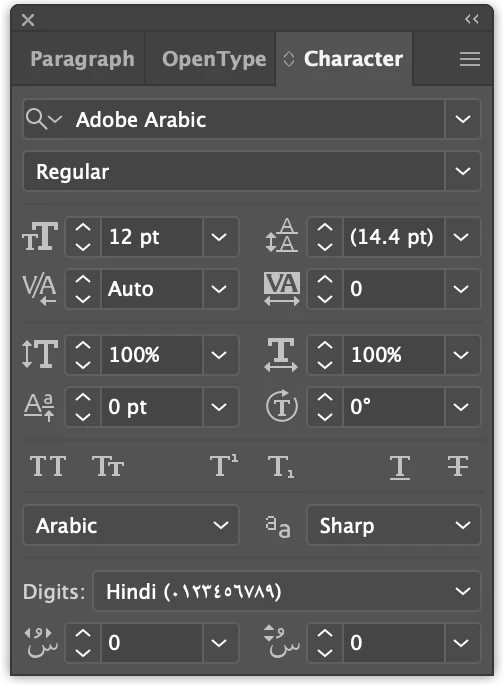 Hyphenation is set to English UK - but the default font still Adobe Arabic and the default type tool is set to Right to Left
