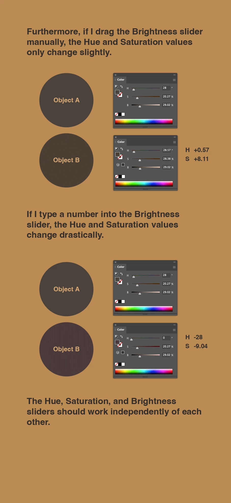 If I want to match the Brightness value of one object to another, sliding the Brightness value also changes the Hue and Saturation.