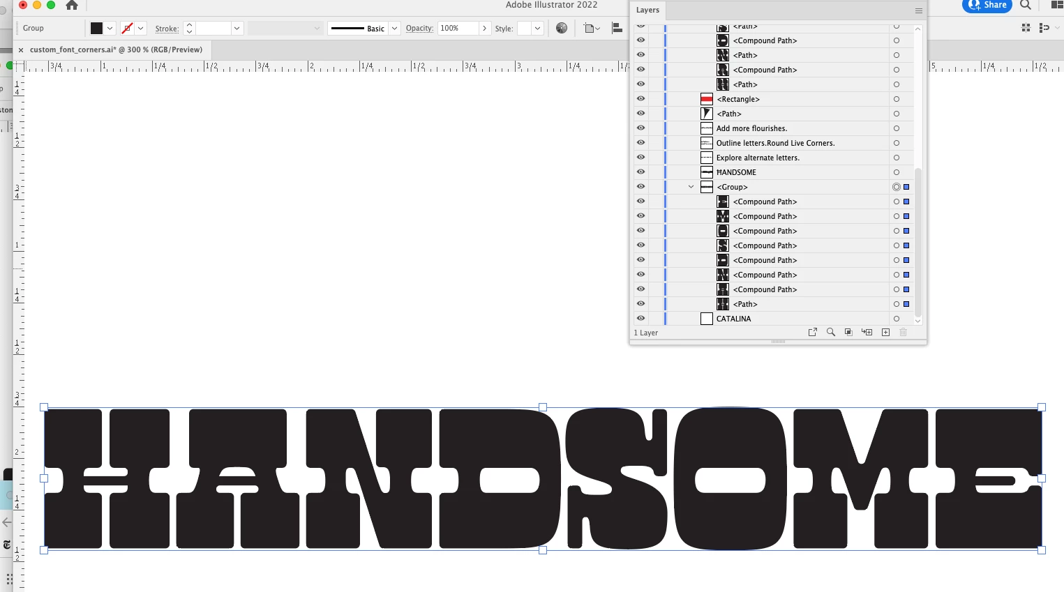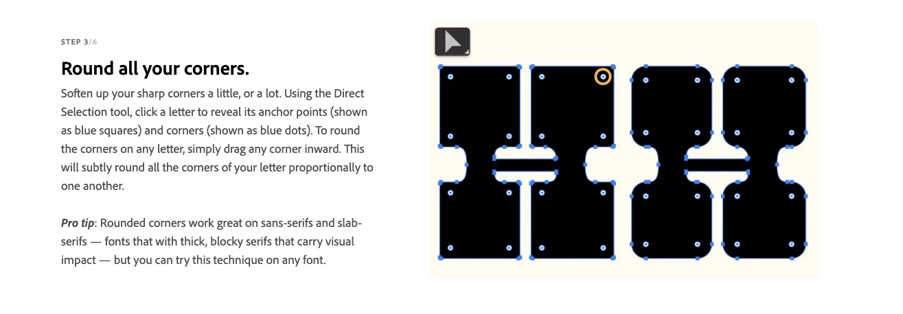 I looked at the tutorial and with the Direct Selection Tool, click on the letter and you will see the white circles with blue dot in middle. Click on the top right circle (I did the H letter). You may need to click dot a couple of times until it becomes a blue circle with a white center (your direct select tool will have a curved line with a dot underneath it), then click and hold your mouse button down and drag towards the lower left and the top right corner will start to round.