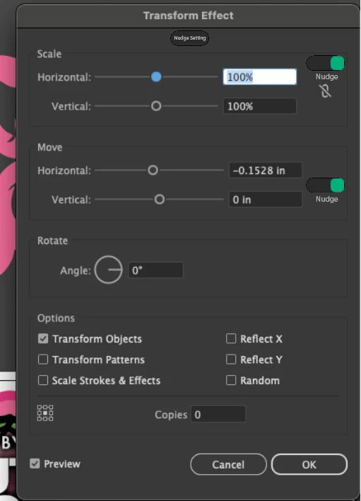 2: A nudge button option(s) for transform effect panel with a setiing to adjust by how much  ..