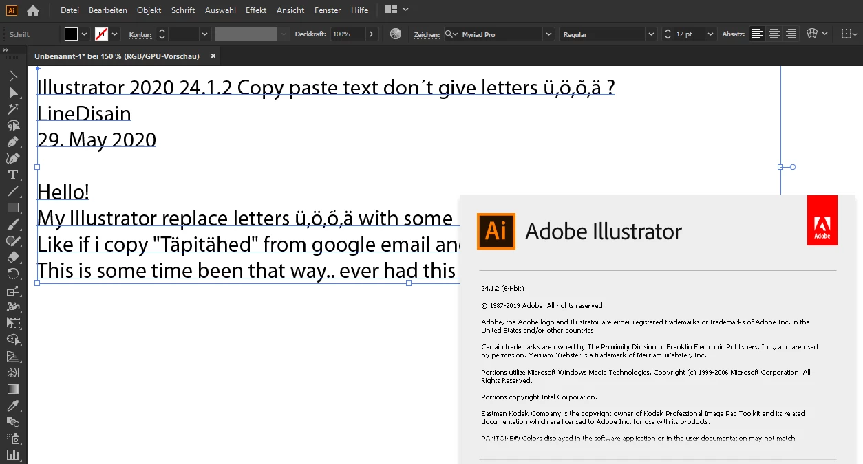 Illustrator 2020 24.1.2 Copy paste text don´t give letters ü,ö,õ,ä ?