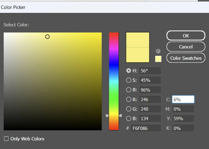 For example, at first I selected the color code F6F086 and clicked ok, but immediately after checking the color code again, the parameters were changed from C: 5% to 6% and Y: 60% to 59%.