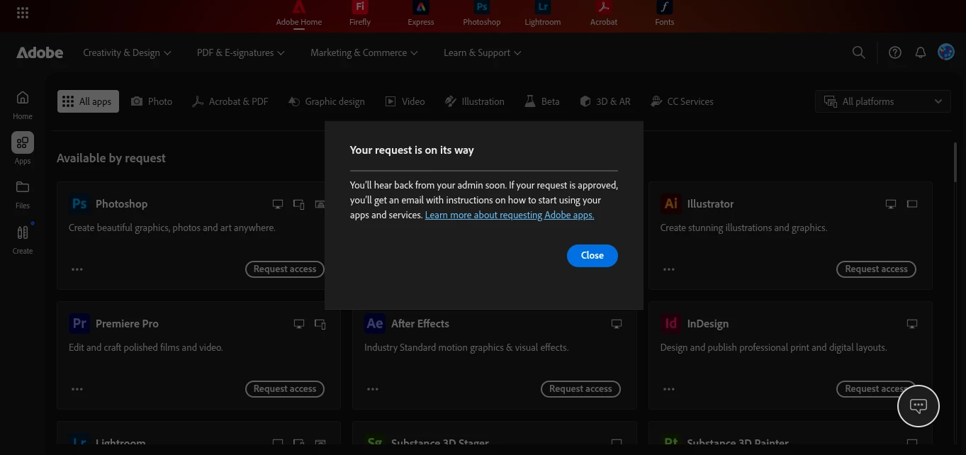 I have purchase Illustrator for 1 Year, but now getting error says "Request Access", I try login from Cloud Account there's no option for grant access, i try uninstall form cloud maybe some error i think, but when try installing again, the app still say "request acces" and i can't install illustrator, please help