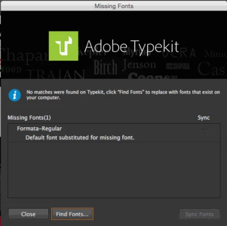 Alas, the new Illustrator has a missing fonts dialog box that will not go away. It has the TypeKit logo at the top, so many folks, me included, got annoyed with TypeKit, but that was misplaced.