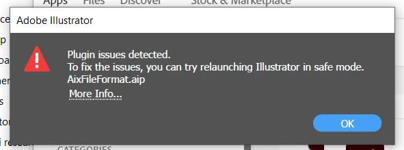 Everytime i open up Illustrator this error msg as seen below. I am trying to work with .Aix files that I have exported from Arcgis Pro. I have tried various methods to fix but to no avail.