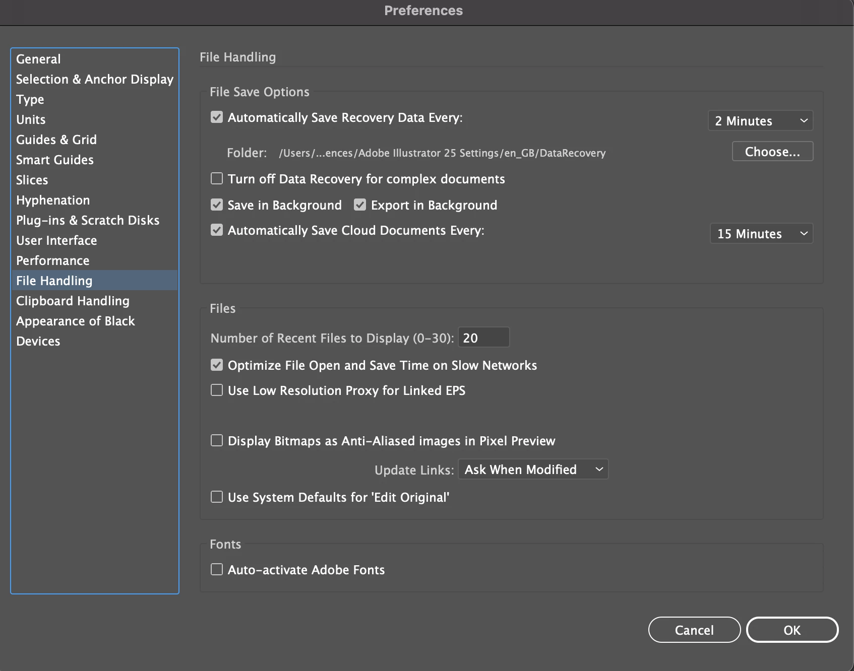 1. Go to Illustrator File Handling preferences