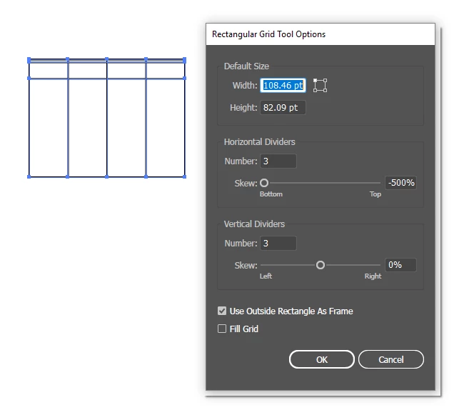 I haven't used the Rectangular Grid Tool in a while, but now I need to and I'm finding that the horizontal dividers skew is refusing to stay set to zero. I open the Rectangular Grid Tool Options, set the number of dividers, set the skews to zero, click OK, draw my grid, and the divisions come out non-linear, as shown below. When I look back at the options, the horizontal divider skew has reset to -500% or something of that order of magnitude. No matter what I do I can't seem to make Illustrator generate a regular grid. Really annoying.